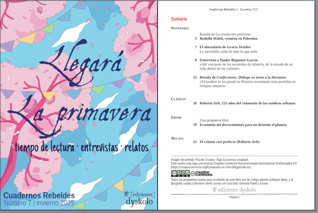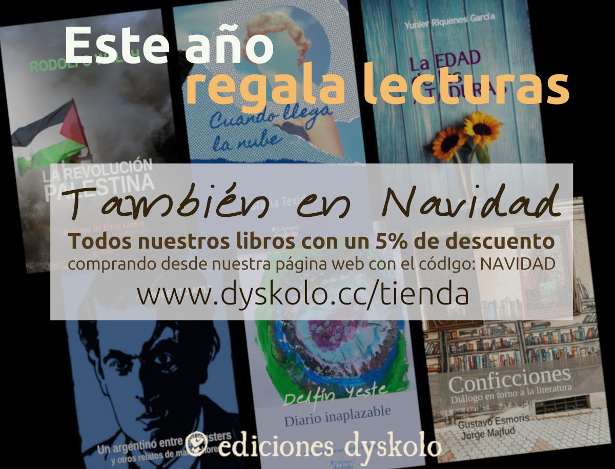 En esta nueva entrega de nuestra revista recogemos reseñas y entrevistas, aparecidas en varios medios, sobre algunos de los libros publicados por Dyskolo a lo largo de este año 2025. Un año en el que hemos publicado 6 libros en papel y 8 ebooks, y hemos participado por primera vez en la Feria del Libro de Madrid. Dos novelas: Cuando llega la nube (Gracia Texidor) y La edad de las ataduras (Yunier Riquenes). Dos ensayos: La revolución palestina (Rodolfo Walsh) y Conficciones (Gustavo Esmoris). Un poemario: Diario inaplazable (Delfín Yeste); y una antología de relatos policíacos, Un argentino entre gángsters (Roberto Arlt), que acaba de llegar a las librerías para conmemorar el 125 aniversario del nacimiento del autor.